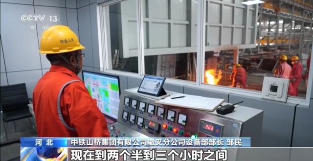 中鐵山橋集團有限公司轍叉分公司設備部部長 鄒民:現(xiàn)在的工作間由以前單一的機械操作平臺,變成現(xiàn)在全自動的。所有的數(shù)據(jù)采集,包括能源采集、指標各種元素的反饋、安全報警裝置,由以前多人變成現(xiàn)在就由一個操作。以前一爐鋼水得煉四個小時左右,現(xiàn)在到兩個半到三個小時之間。