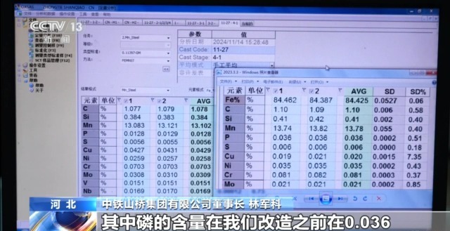 中鐵山橋集團有限公司董事長 林軍科:這個表里可以清晰對比到,在改造升級之后,對有害元素、雜質、夾雜物的控制,做到大幅度降低。其中磷的含量在改造之前是0.036,今年改造完之后,它控制到0.0128,這對轍叉的使用壽命會有顯著改善。